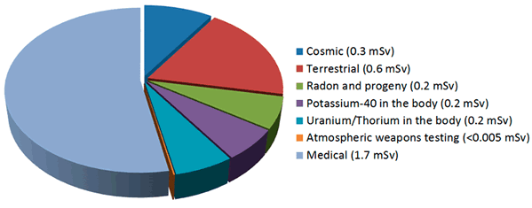 Pie chart showing annual per capita radiation dose from natural and medical sources - cosmic (0.3 mSv); Terrestrial (0.6 mSv); Radon and progeny (0.2 mSv); Potassium-40 in the body (0.2 mSv); Uranium/Thorium in the body (0.2 mSv); Atmospheric weapons testing (<0.005 mSv); Medical (1.7 mSv)